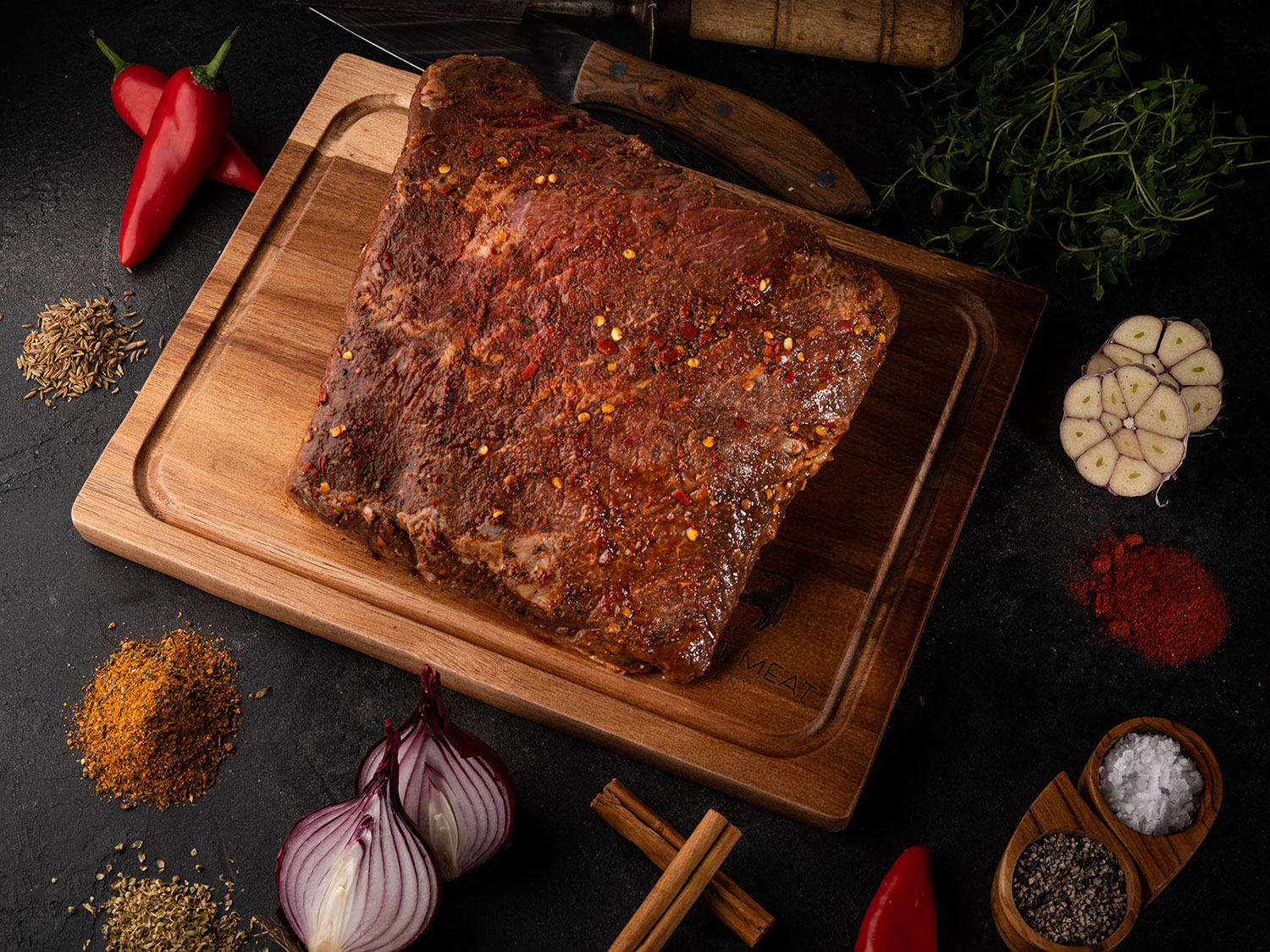 Beef Chuck, SUGAR, TOMATO POWDER, SPICE, SALT, DEHYDRATED CHILLI FLAKES, ACIDITY REGULATOR E262, ONION POWDER, HERB, GARLIC POWDER, SPICE EXTRACT, GARLIC EXTRACT